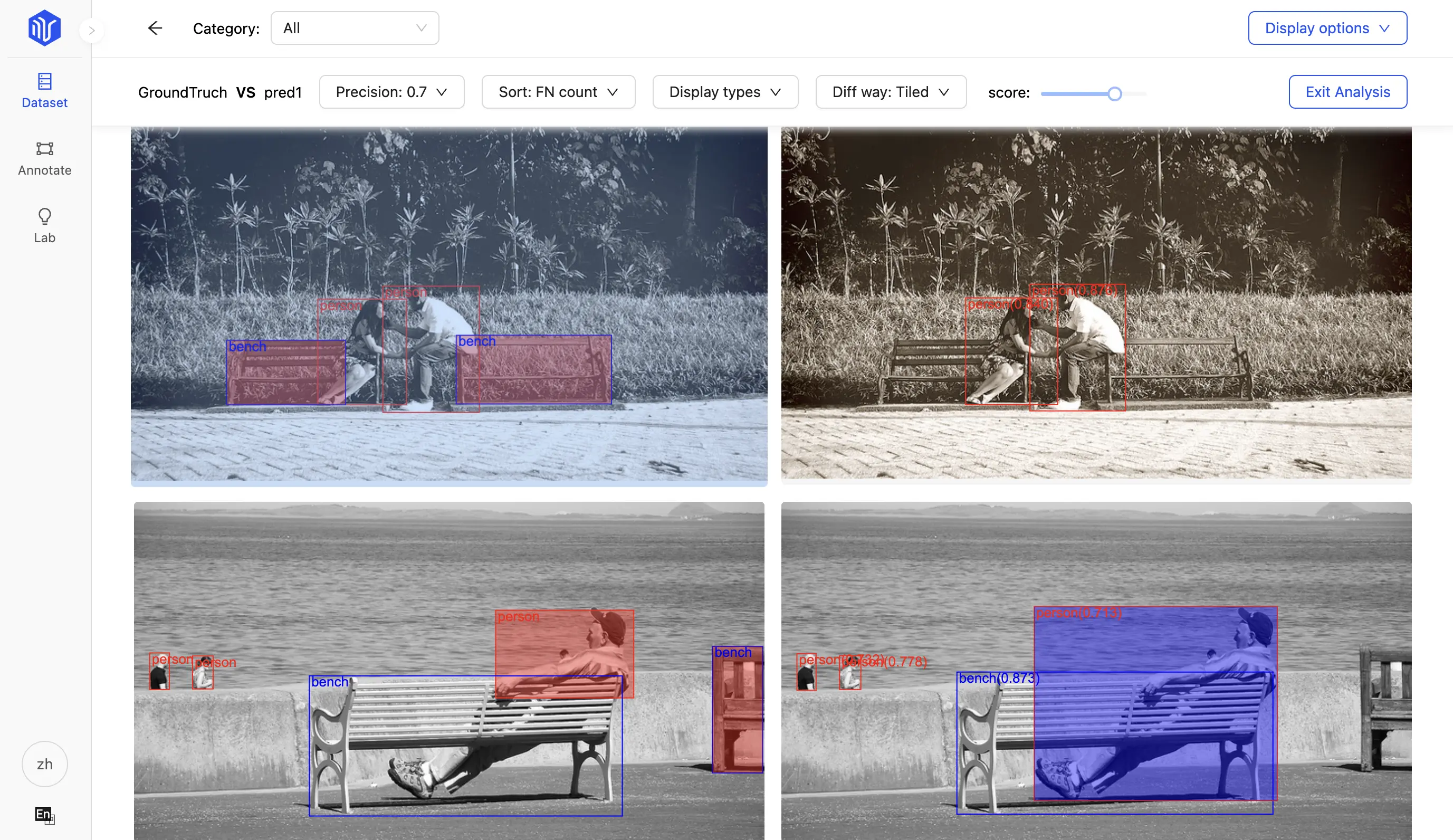 DeepDataSpace支持对比模型预测结果和GroundTruth的差异,并提供模型指标计算功能,帮助用户高效地定位模型缺陷,以更好地优化模型。
