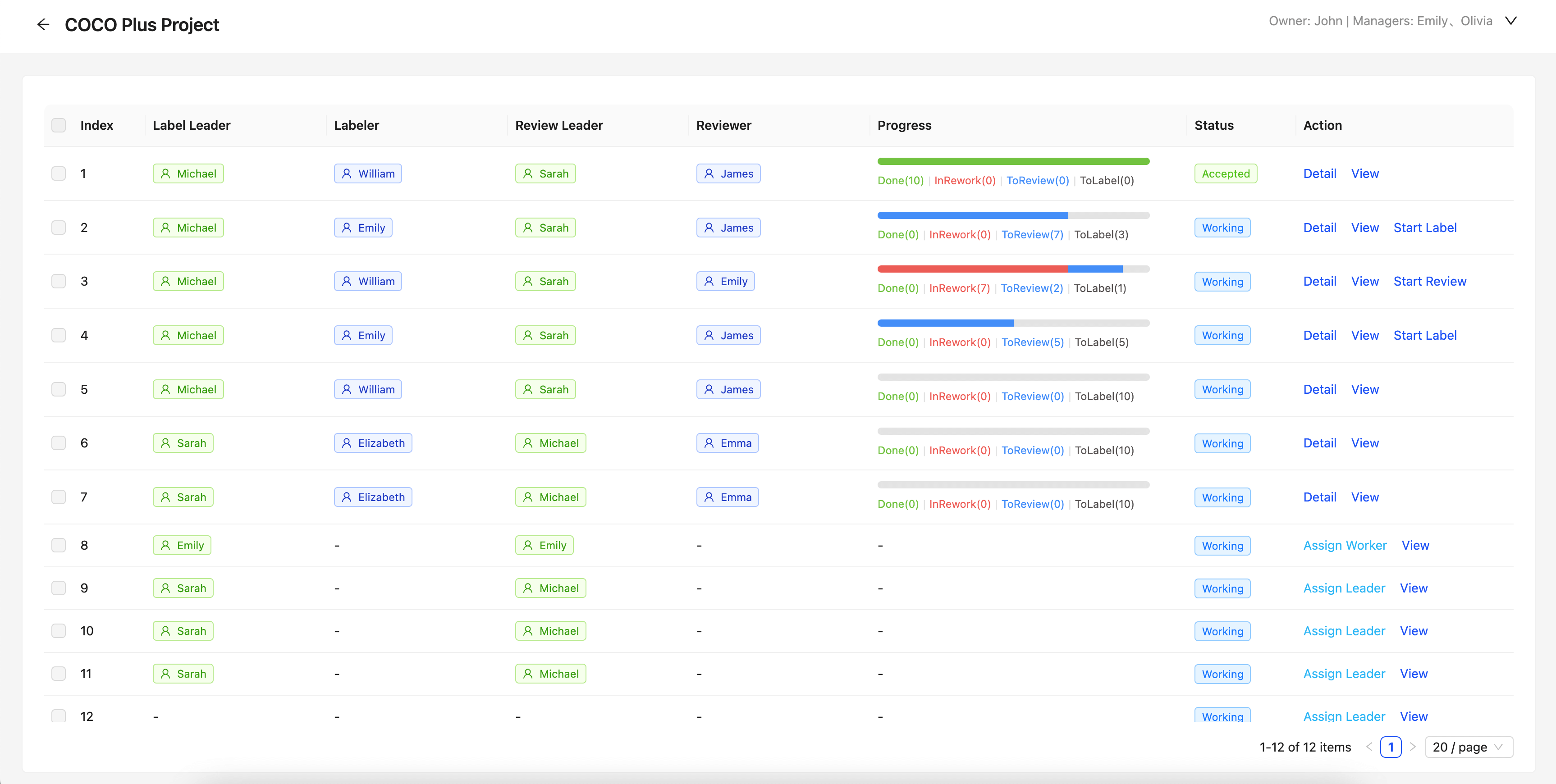 DeepDataSpace支持建立多人协作的工作流程,将项目委托方管理人员、标注团队、质检团队连接在一起,并提供了任务委派、进度监控、质量检查等功能,以确保标注项目的进度和质量,创建高质量的数据集。